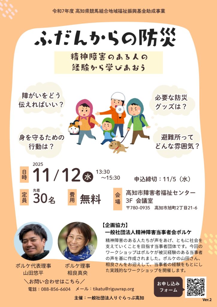 本ワークショップは、実際に被災された精神障害のある方々への調査研究に基づき作成されたもので、「被災時に何に困ったか」「何が必要だったか」といった貴重な経験をもとにした実践的なワークショップで、東京から(一社)精神障害者当事者会ポルケの方をお招きします。