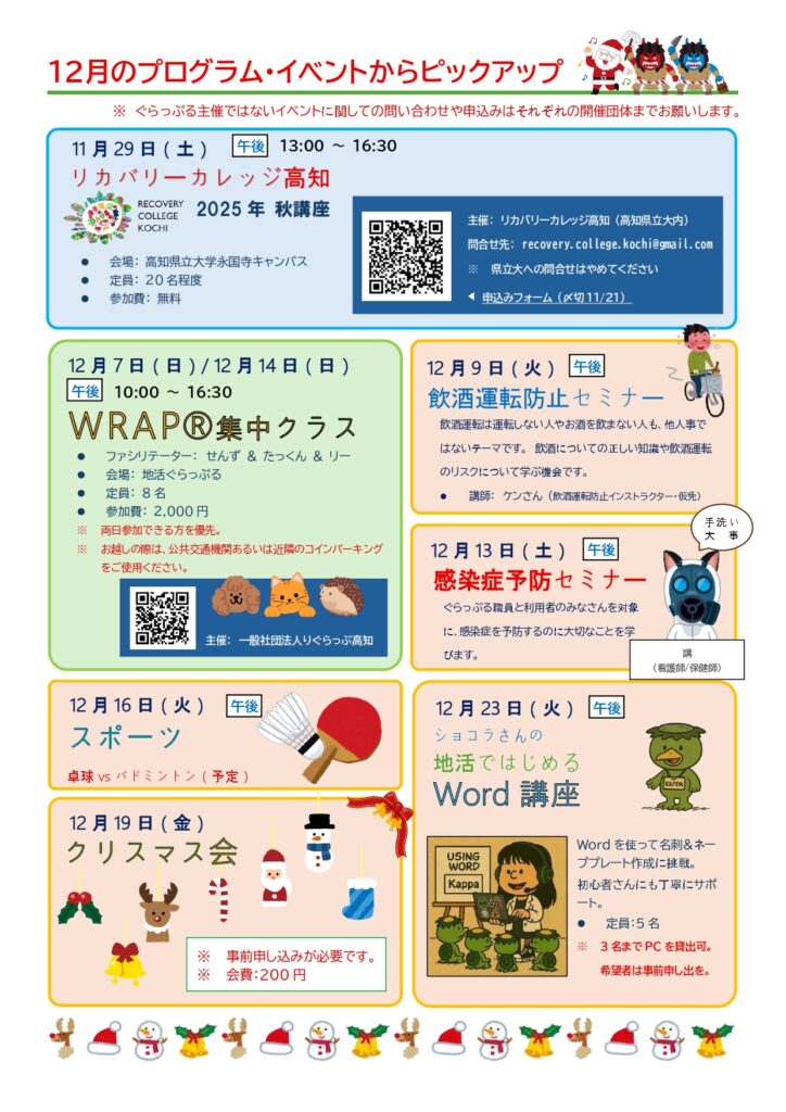 12月は飲酒運転防止セミナー🍺🚴‍♀️や感染症予防セミナー😷、クリスマス会🎄(要申込)など普段とは違ったプログラムも盛り込んでありますのでご興味があるプログラムにぜひご参加ください。