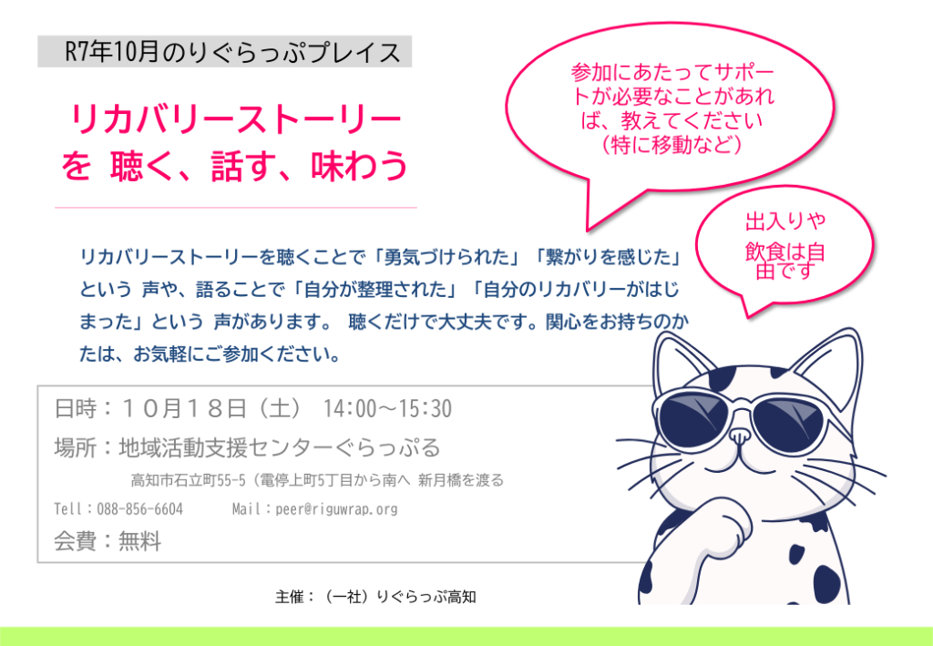 引き続き「リカバリーストーリーを聴く、話す、味わう」をテーマに、どなたでもご参加いただける相互の学びの場を開いています。